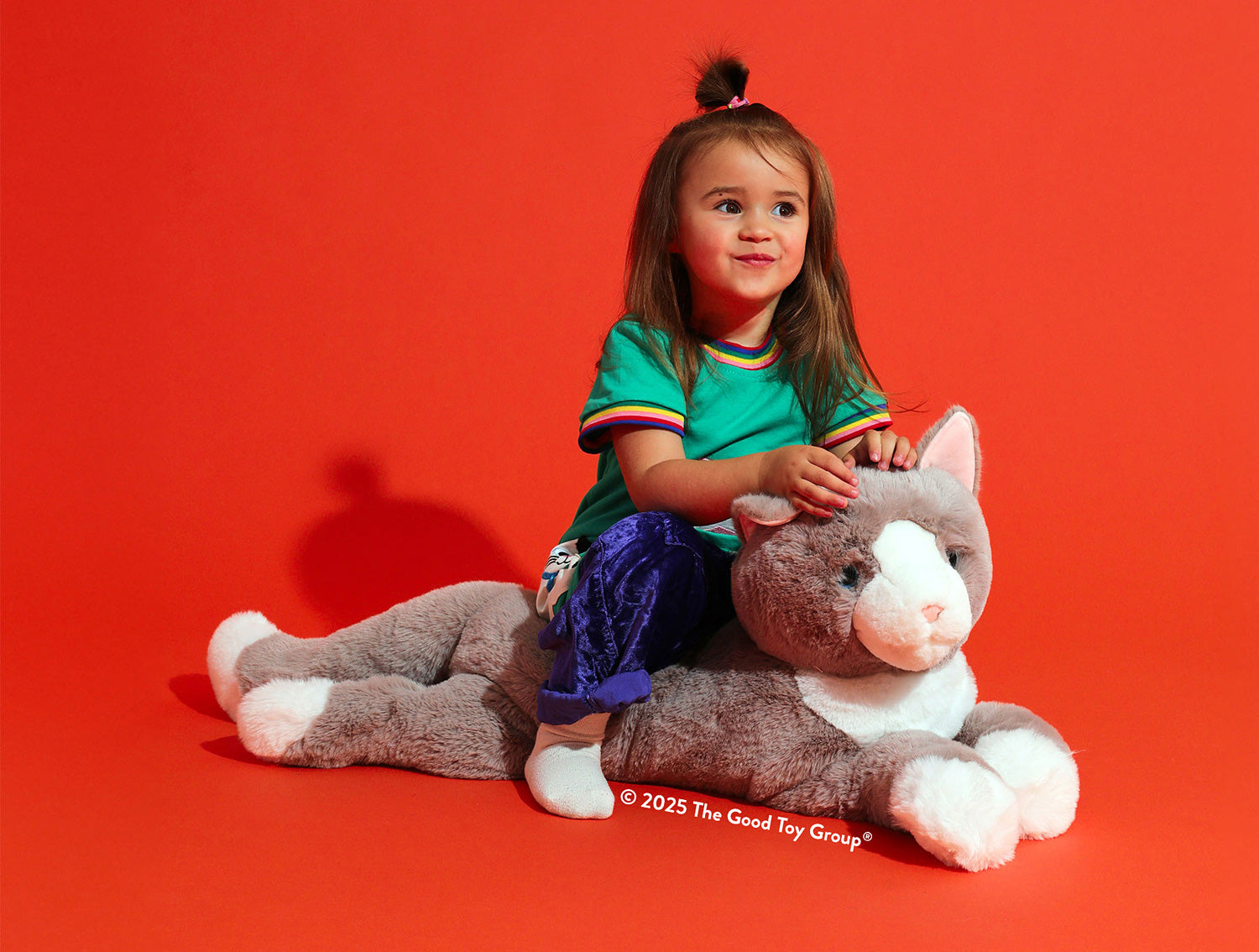 Calling all grandparents: here's a gift that wows! This super cuddly jumbo plush cat is ready for years of memory-making adventures! Stretching 30" in length, Boots the grey and white cat is bright-eyed and ready for full-bodied hugs. Kiddos are drawn to her size, bright blue eyes, pink ears and nose, and sweet softness. Boots will look great lounging under a tree on Christmas morning, and will leave kids awestruck as they pull her out of a giant gift box!