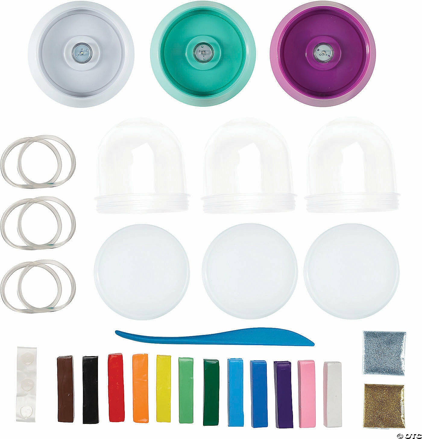Light up their eyes with this deluxe snow globe kit. Three battery-operated bases have LED lights in three unique colors. Young artists can mold their own creations then oven-bake before assembling their globe. Choose from two different micro-glitter colors then light up the globes and shake for a magical display. Great for making gifts for loved ones or commemorating special occasions.