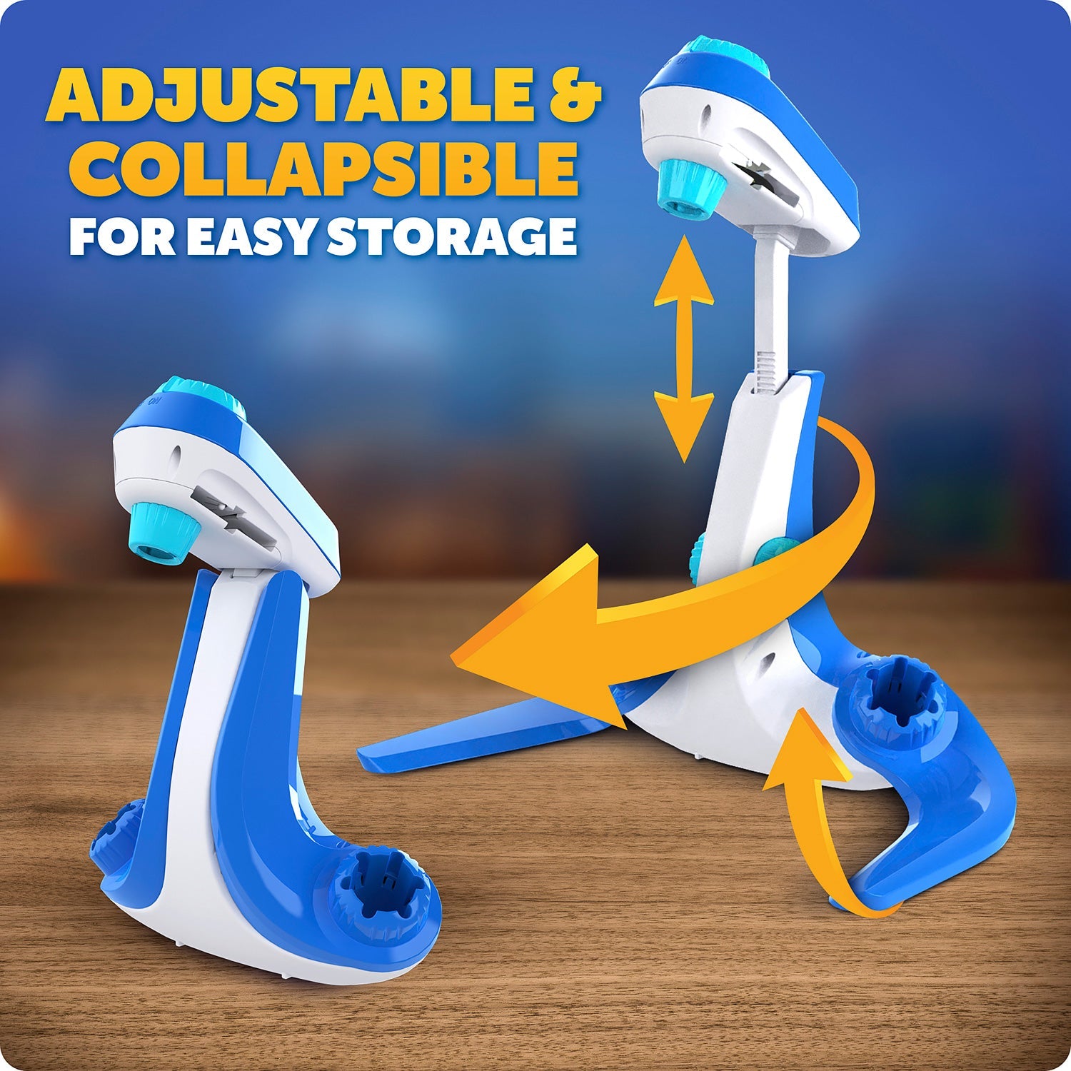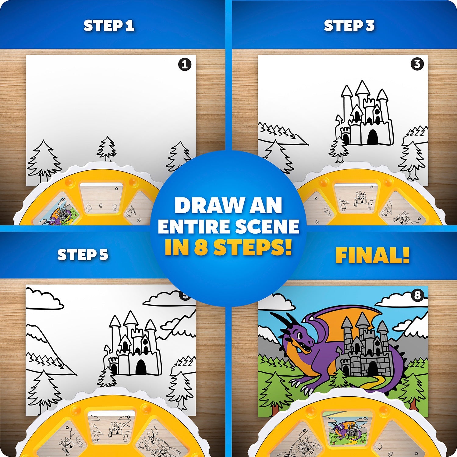 Kids easily create amazing works of art and develop confidence in their drawing skills with this incredible projector. A height-adjustable, tilting light source reduces the occurrence of shadows while sketching. The 4 swappable image discs help kids draw 25 animals, dinosaurs, and fantasy creatures. The fourth disc is a step-by-step drawing tutorial that guides them through drawing an entire scene. Follow the color suggestions using the 9 included markers, or customize with their own art supplies! It's easy to use, simple to set up, and has convenient storage features like disc holders and folding legs. Requires 3 AAA batteries, not included.