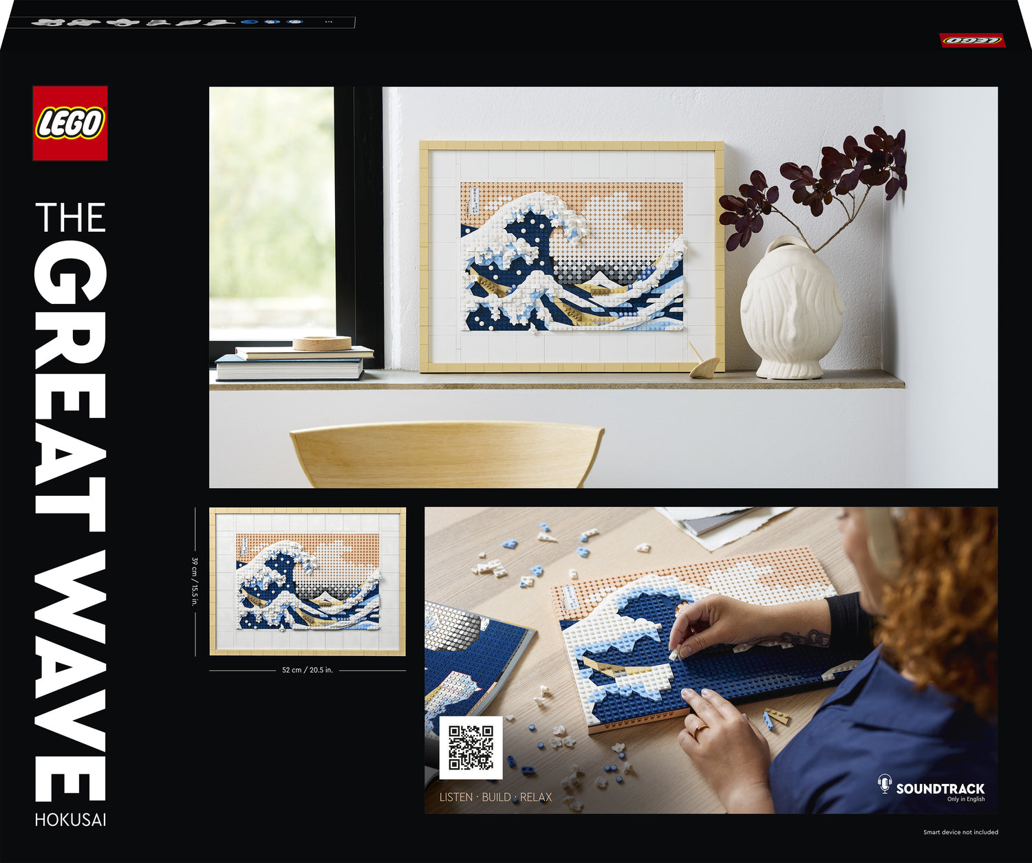 Recreate Hokusai's The Great Wave with layers of LEGO bricks to produce a famously bold and dramatic dimensional piece of art. As you build your own premium home décor, scan the QR code and listen to a soundtrack with content tailor-made to enhance your project. Finish the artwork with a decorative tile featuring Hokusai's signature, and proudly display on your wall.