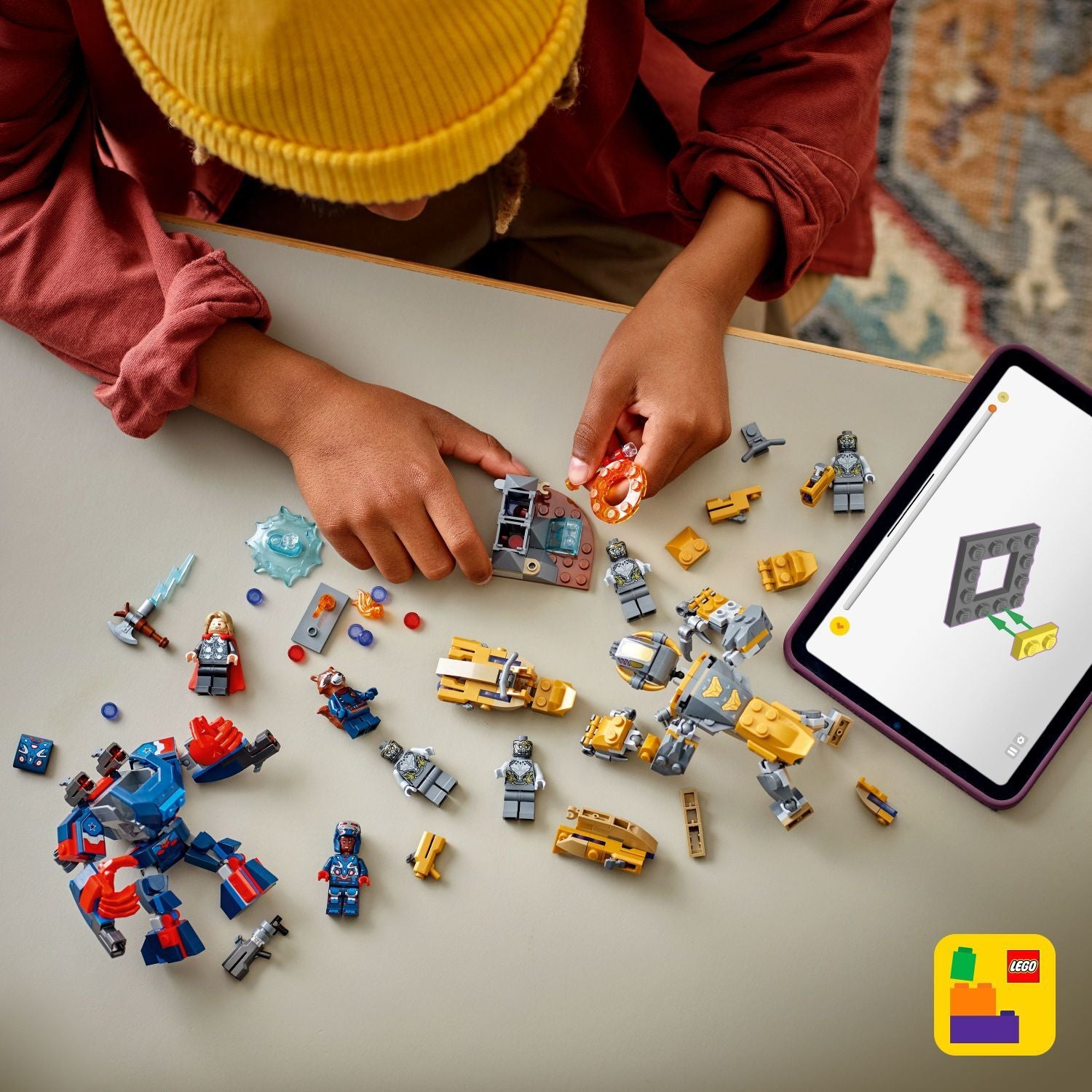 • LEGO® Marvel minifigures – There are 7 minifigures: Iron Patriot MK2; Rocket with a large stud shooter; Thor with Stormbreaker; and 4 Chitauri, 2 of which have golden stud shooters