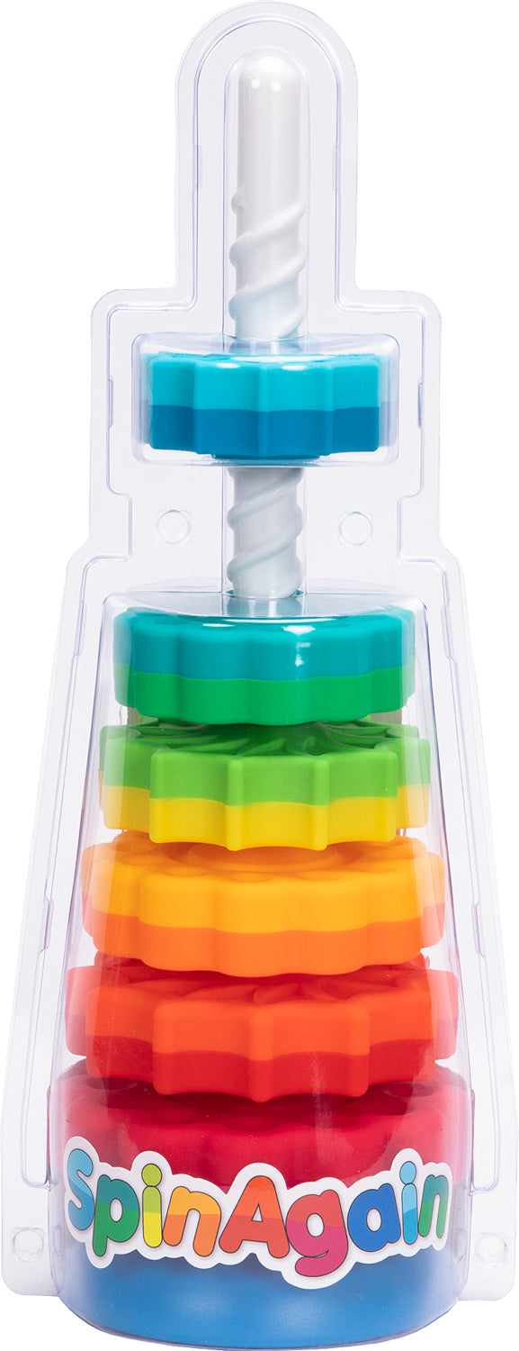 Keep your little ones enthralled with a visually stimulating, twirling, spinning toy! Toddlers practice hand-eye coordination and early engineering skills by dropping vibrant discs onto the threaded corkscrew pole and watching them spiral down onto the base. They can stack by size, color, pattern, shape, or however they want, and then lift up the pole to release all the discs and play again! For added wonder, the base can flip to a wobbly side as an extra stacking challenge. Includes: 6 colorful discs, a reversible wobble base, and a corkscrew pole.