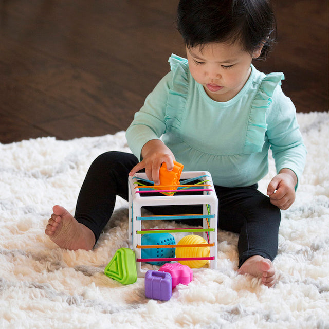 Here are six chunky, textured blocks to delight and challenge little ones as they push each shape through the elastic bands of this cube. In, out, repeat. Each time brings a little more curiosity, joy, and yes, learning.